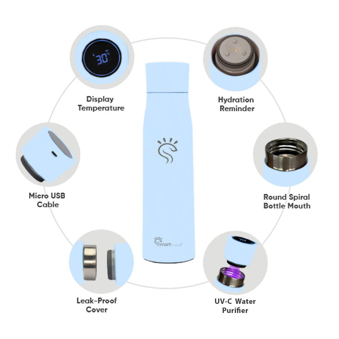 Enhance your daily hydration with the Smart UV-C LED Flask, where cutting-edge technology meets top-tier purification for the ultimate drinking experience. Now available in the refreshing Ice Blue shade in a convenient 750ml size. Whether you're commuting, traveling, or simply staying active, this blue stainless steel water bottle delivers functionality with unmatched style.